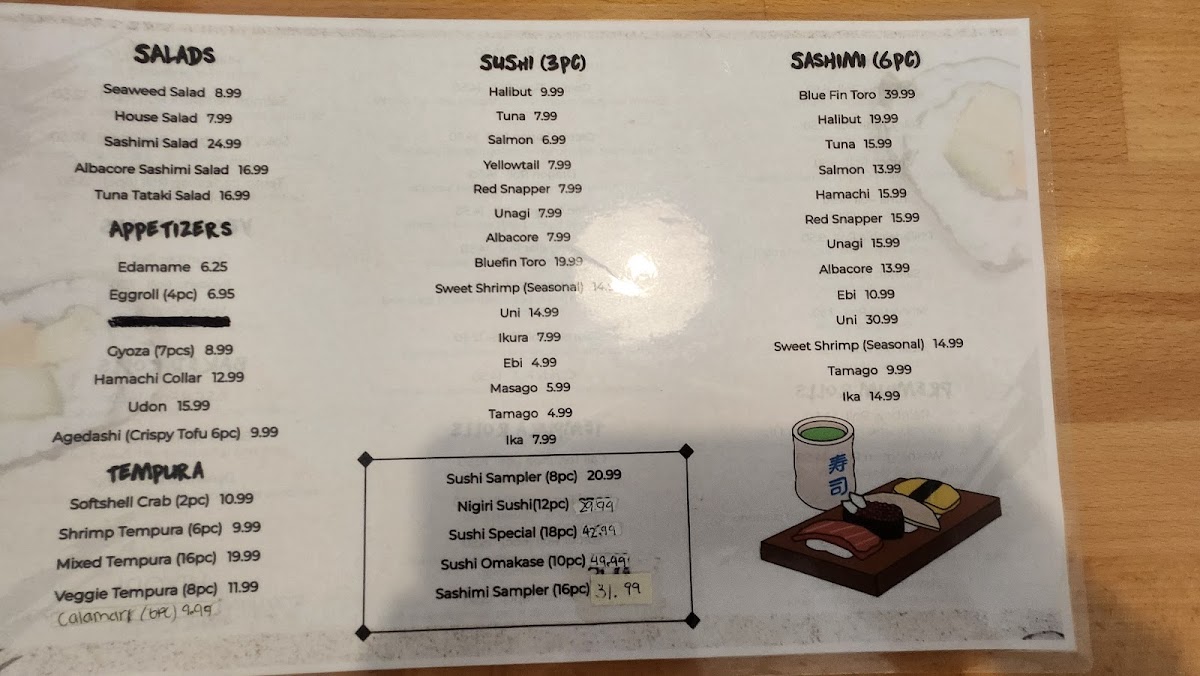 Guests can expect well-prepared classic rolls like the Albacore Roll and California Roll, alongside creative tempura rolls such as the Spider Roll and Philly Crunch Roll. Bento boxes provide a complete experience with options ranging from grilled mackerel to marinated beef, typically served with sides like miso soup and tempura, making them a comforting choice when you want a full meal in one package.